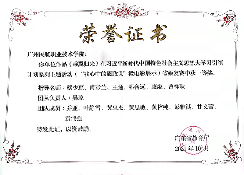 2021年是中国共产党成立100周年,是“十四五”开局之年。为贯彻落实习近平总书记关于深化思想政治理论课改革创新和加强“四史”教育的重要指示批示精神,坚持不懈用习近平新时代中国特色社会主义思想铸魂育人,引导学生在“大思政课”中受教育、长才干、作贡献,我校党委办公室、人文社科学院(思政部)组织师生积极参加“我心中的思政课”——第五届全国高校大学生微电影展示比赛。由我校蔡少惠、肖彩兰、王通、郜会远、康淑、曾祥耿六位教师指导,2019级空中乘务专业吴琼等学生主演的微电影《乘翼归来》紧紧围绕习近平总书记“让青年学生到基层和人民中去建功立业,让青春之花绽放在祖国最需要的地方”这一主题,讲述一名懵懂青年学子因航空知识文化下乡的活动结缘无人机,走出大山、学成归来的故事。这一微电影融入青年大学生、农村发展建设、非物质文化遗产、无人机、旅游业、民航业等元素,主旋律积极向上、主题鲜明、内容丰富、人物角色饱满,荣获“我心中的思政课”第五届全国大学生微电影展示活动广东省一等奖。