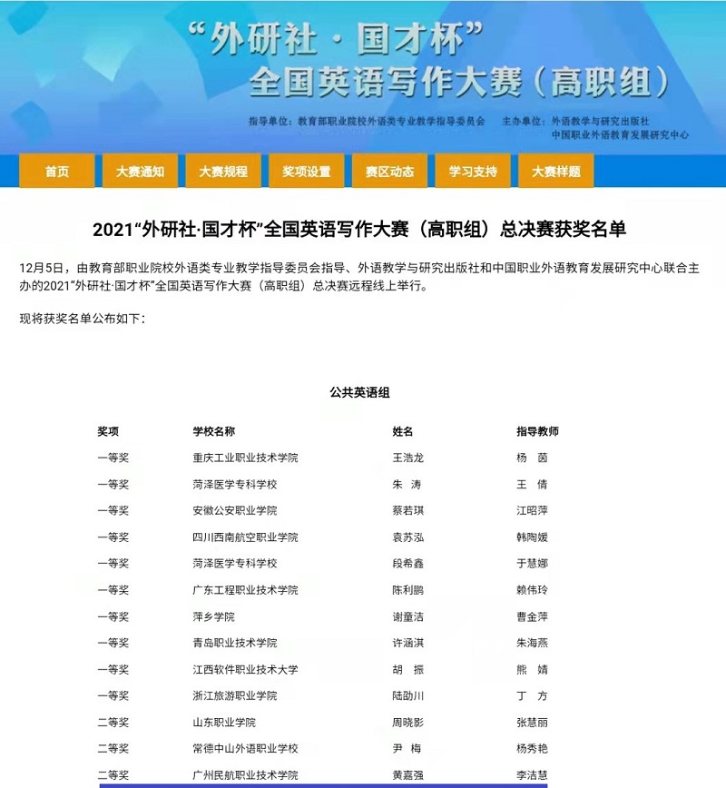 12月5日,2021“外研社·国才杯”全国英语写作大赛(高职组)总决赛开赛,本赛事由教育部职业院校外语类专业教学指导委员会主办,赛事规模高,参赛范围广。全国700余所高职院校的2000余名学子参加省赛复赛,全国28个赛区的120名选手参加了全国公共英语组总决赛。