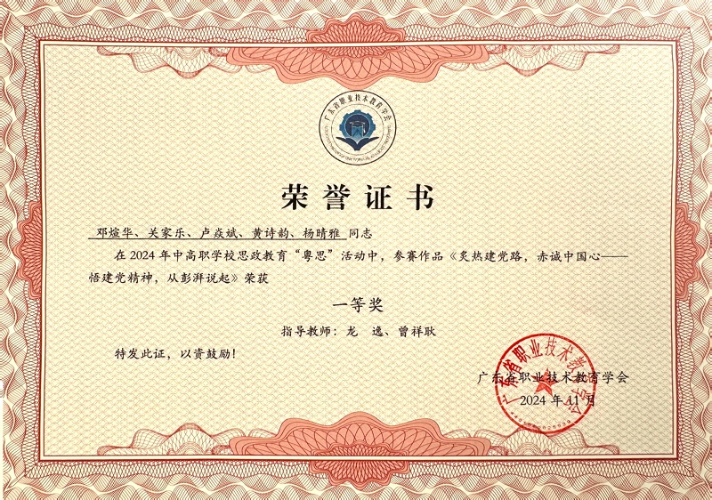 为统筹推进“大思政课”建设,聚焦立德树人根本任务,广东省职业技术教育学会思政工作委员会于今年10月开展2024年中高职学校思政教育“粤学·粤思·粤行”活动。此次“粤学”活动一等奖 5 名,二等奖 6 名,三等奖 7 名;“粤思”活动一等奖 6 名,二等奖 7 名,三等奖 9 名;“粤行”活动一等奖6 名,二等奖 6 名,三等奖 6 名;“粤思•粤行”活动优秀指导教师 12 组。