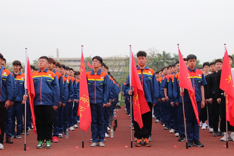 动员大会开始,全场起立,奏唱国歌。会上首先由飞机维修工程学院党总支部书记方松作军训动员讲话。他指出军训是大学教育的一门必修课,也是人生的重要一课。通过军训可以增强同学们的国防观念和国家安全意识、增强组织纪律观念,大力弘扬爱国主义精神、培养艰苦奋斗的作风,提高学生综合国防素质。方书记也表达了对荔湾区人民武装部官兵的感谢之情,并向全体参训学生提出了做好疫情防控、端正军训态度、服从指挥管理、认真参训的要求,希望大家在军训中树立良好的集体荣誉感、严格要求自己、刻苦训练,用积极的心态激励自己感染他人,圆满的完成军训任务。接着,学校保卫处刘刚老师宣读《广州民航职业技术学院新生军训守则》,强调军训期间的纪律要求。随后,2020级飞机电子4班旷煌辉代表新生发言,他代表全体新生向学校和教官做出“做好疫情防控、听从指挥、积极训练”的承诺,大家坚定信念迎难而上,用昂扬的斗志争创佳绩。