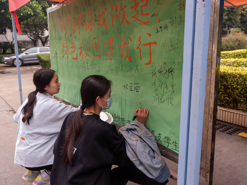 本次活动以“绿色、环保、节约”为主题,分为“绿色签名活动墙”和“绿色光盘行动”两个系列活动。当日,校内活动处人头攒动,在校学生积极参与,反响热烈。在绿色签名活动环节中,学生纷纷在倡议书上签名,表达自己对“绿色学校”创建行动的大力支持。为了进一步促进“绿色、环保、节约”观念进校园,学院还在学校食堂分别设点,在就餐学生群体中倡导“绿色光盘行动”,鼓励学生将思想认识与生活实践相结合,在点滴校园生活中贯彻落实绿色学校创建精神。