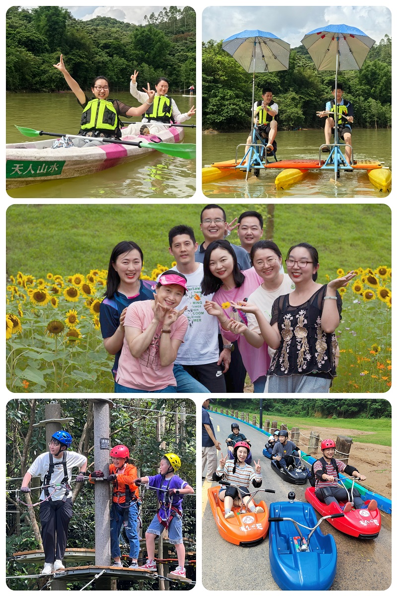 在艺术园中,老师们沿着山谷一路漫步,拥抱大自然,呼吸清新空气,感受户外行走的轻松愉快。 山溪清泉、中西造园艺术、木桥栈道、湿地花海以及随处可见的诺诺兔子车,让人仿佛置身于童话故事中,目光所及之处皆是风景,无不让人流连忘返。向日葵花海、绣球花径、欧式古堡风格的玫瑰花谷……老师们三五成群畅游在花海中,用手机定格美好的画面,为自己留下难忘的回忆。在沙溪水库骑水上单车、划桨板或皮划艇,在南粤古驿道森林徒步、在山林间来场丛林穿越、在溪谷里溯溪戏水、在山顶打卡网红山道滑车……几十项活动项目让大家充分亲近绿水青山,大小朋友随意畅玩。
