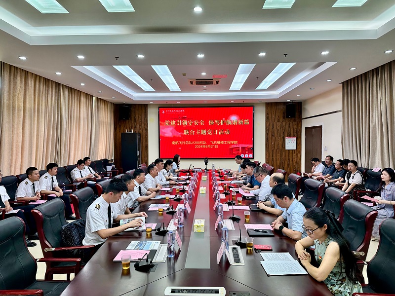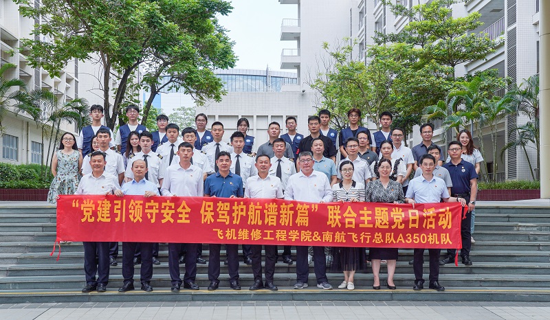 6月21日下午,南航飞行总队A350机队前来白云机场校区,与飞机维修工程学院党总支部携手开展联合主题党日活动。南航飞行总队A350机队党委书记黄海、党委副书记王龑、飞行总队A350机队负责人周鹤、副经理马勇、A350机队运办资深主管佟斌、综合办主任王黎明、A350机队班组长朱然仲及飞行员代表,飞机维修工程学院党总支部方松书记、田巨院长、黄白玲副院长、陆轶副院长、王舰副院长及学院各党支部书记、支委,南航俱乐部学生成员代表参加了本次活动。