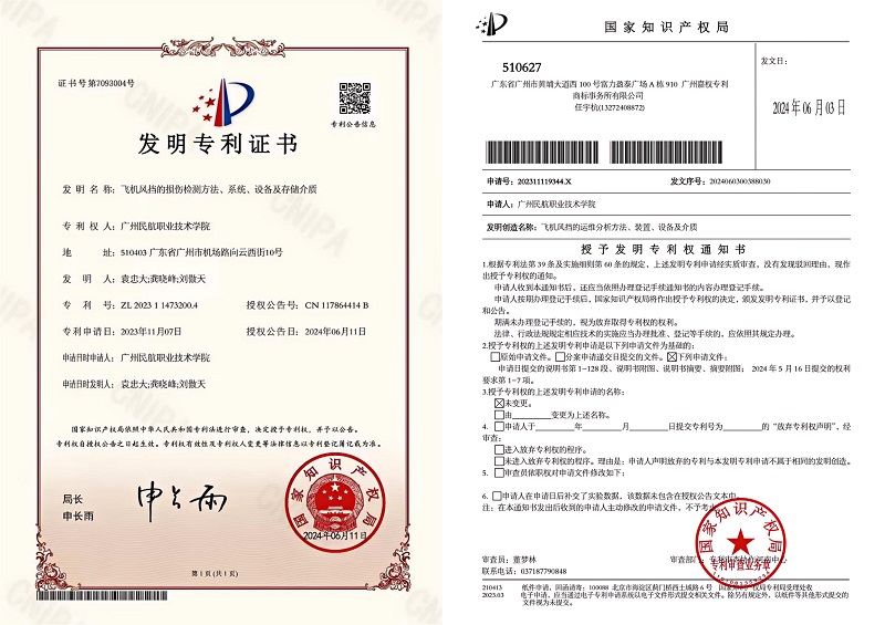在飞机风挡故障检测与运维分析方向,飞机维修工程学院创新创业实验室负责人袁忠大副教授及其学生创新团队共申请国家发明专利5项(其中已授权2项,其他3项均处于实质审查阶段),授权实用新型专利1项:一种飞机风挡装置及飞机风挡系统(ZL 2023 2 1506244.8);发表及录用北大中文核心期刊2篇;获立项广东省教育厅特色创新项目1项,广东省科技创新战略专项资金2项。