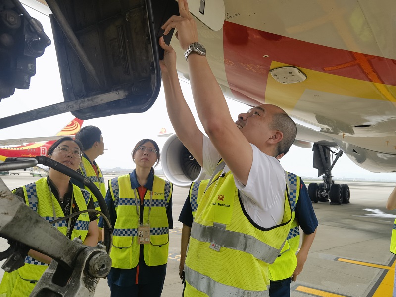 活动中,在海航技术广东维修基地工作人员的带领下,我院师生参观了海航技术广东维修基地广州办公室、工具房、安全操作警示墙、员工休息室等场所,并前往机坪近距离观摩了海航A330客机,聆听了广州维修中心赵峰经理对客机零部件构成的详细、专业讲解,了解了作为一名机务人员的具体工作内容与职责要求,给师生们上了一堂生动深刻的专业实践课。