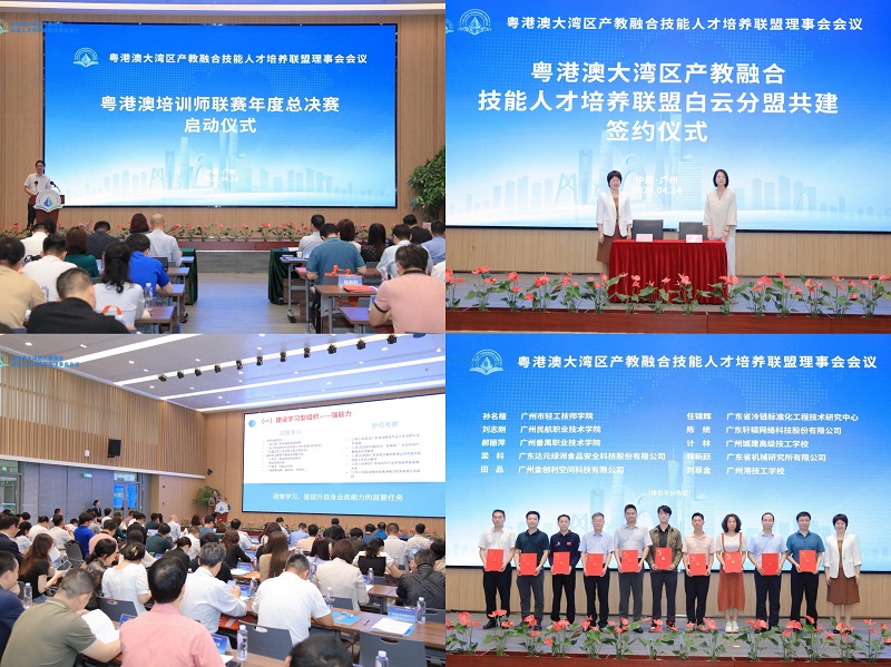 4月24日下午,粤港澳大湾区产教融合技能人才培养联盟理事会会议在广州白云区国化广场举办。会议以“共商产教融合发展,共议技能人才培养”为主题,发布了年度工作报告,成立了由广州市白云区人力资源和社会保障局共建的白云分盟,启动了粤港澳培训师联赛年度总决赛。广州市人力资源和社会保障局、广州市发展和改革委员会、广州市教育局、广州市总工会、广州市白云区人力资源和社会保障局及联盟理事长单位等相关人员代表参加了会议。会上,就“内涵建设+机制创新 筑牢高质量发展基础”、“产教融合+品牌打造 优化技能人才新生态”、“以赛为桥+规则衔接 打造湾区融合新高地”等模块进行了精彩纷呈的交流研讨。
