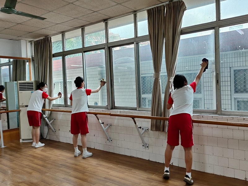 同时,学院还开展了“美化实训室,我们在行动”实践活动,组织2023级部分学生对形体房、健身房、空保技能训练室等专业实训室进行了大扫除。在辅导员的指导下和勤工俭学学生的共同帮助下,大家分工明确、协调配合,通过认真清扫地面、擦拭灰尘、整理物品,教室环境卫生得到了极大改善,给大家营造了更安全、卫生、舒适整洁的上课环境。