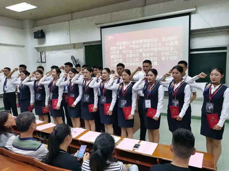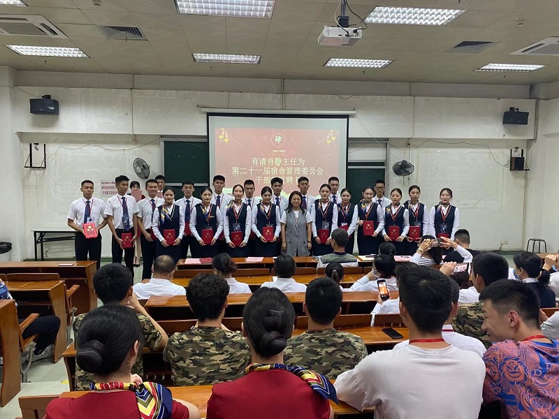 成立大会在庄严的《共青团团歌》中拉开帷幕,第二十届学生干部代表罗林康回顾汇报了上一届宿舍管理委员会的工作与成果。接下来,后勤管理处主任吴妙芸宣读了干部名单。紧接着,学工办肖静主任为干部们颁发任命聘书。新任宿管会主席黄浩伦同学代表新一届宿管会成员作工作设想报告。他承诺将带领同学做好宿舍常规监督管理,做学校、老师和学生的桥梁,为同学们营造一个温馨、和谐的学习与生活环境。