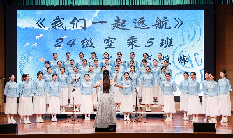 全体新生积极参与本次比赛,历经一个多月的辛苦排练和精心准备,每个班级都用洪亮的嗓音和饱满的热情,充分展现了青年一代对祖国的深情热爱,为大家带来了一场场精彩绝伦的合唱表演。经过前期紧张的初赛选拔,共有12个班级脱颖而出进入本次复赛,这些班级合唱节目编排形式多样、内容丰富,现场气氛热烈,掌声雷动。在激烈角逐中,2024级空中乘务5班荣获一等奖,2024级民航空中安全保卫2班、2024级民航空中安全保卫3班荣获二等奖,这三个班级同时被推选参加后续的学校决赛。此外,比赛还评选出最佳指挥奖等多个奖项。最后,随着云之梦艺术团舞蹈队带来的节目《九州同》,这场视听盛宴就此落下帷幕。