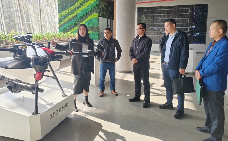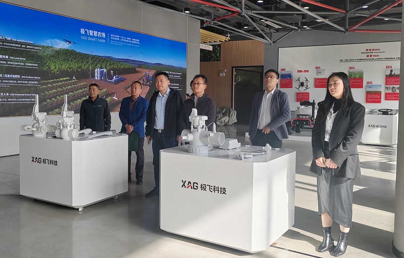 考察团一行实地参观了极飞公司智慧农业展区,观看了公司宣传视频,详细了解多款植保无人机在水稻、棉花等农作物病虫害防治、播种、施肥等方面的应用,以及智能水肥管理系统等可持续无人化智慧农业设施的应用场景。