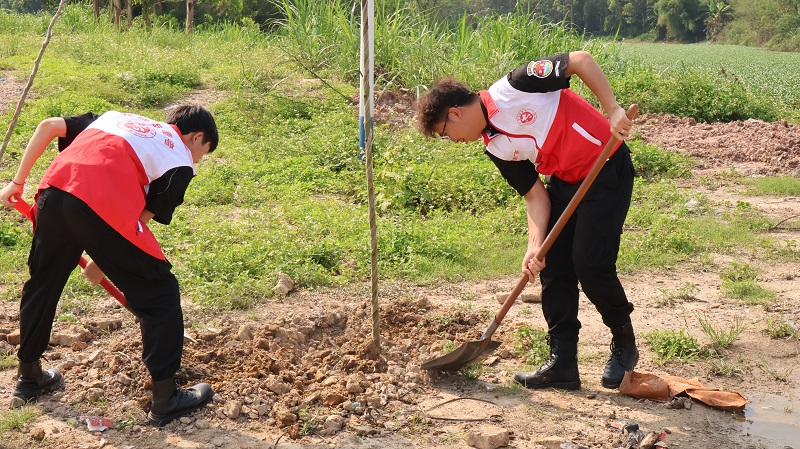 在赤坭镇缠岗村的植树现场,师生们与赤坭镇团委工作人员分工明确、配合默契,挖坑、扶苗、培土、浇水,共同种下紫荆、木棉等树苗,这些树苗被赋予了特殊的意义——“入团树”。赤坭镇团委严倩仪书记表示:“缠岗村是镇团委结对帮扶的重点村,此次活动通过校地联动,不仅美化了村居环境,更为青年学子提供了参与基层治理的实践平台。”航空港管理学院“百千万工程”突击队的师生们表示,种植“入团树”不仅是对乡村振兴的贡献,更是对青年团员使命的传承。
