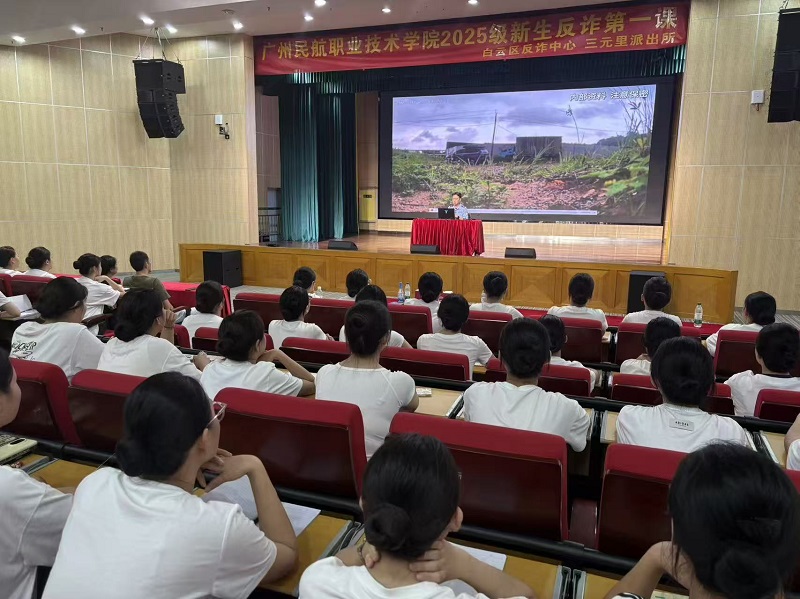 刚踏入大学校园的大一新生们,正迎来一堂“必修课”——反诈安全教育。9月19日下午,白云区反诈中心民警薛源、三元里派出所反诈专班梁英芸一行走进我校机场路校区,为空中乘务学院2025级800名大一新生带来了一场满满“干货”的“开学反诈第一课”,这也是机场路校区新生入学后的首场集中公开课。