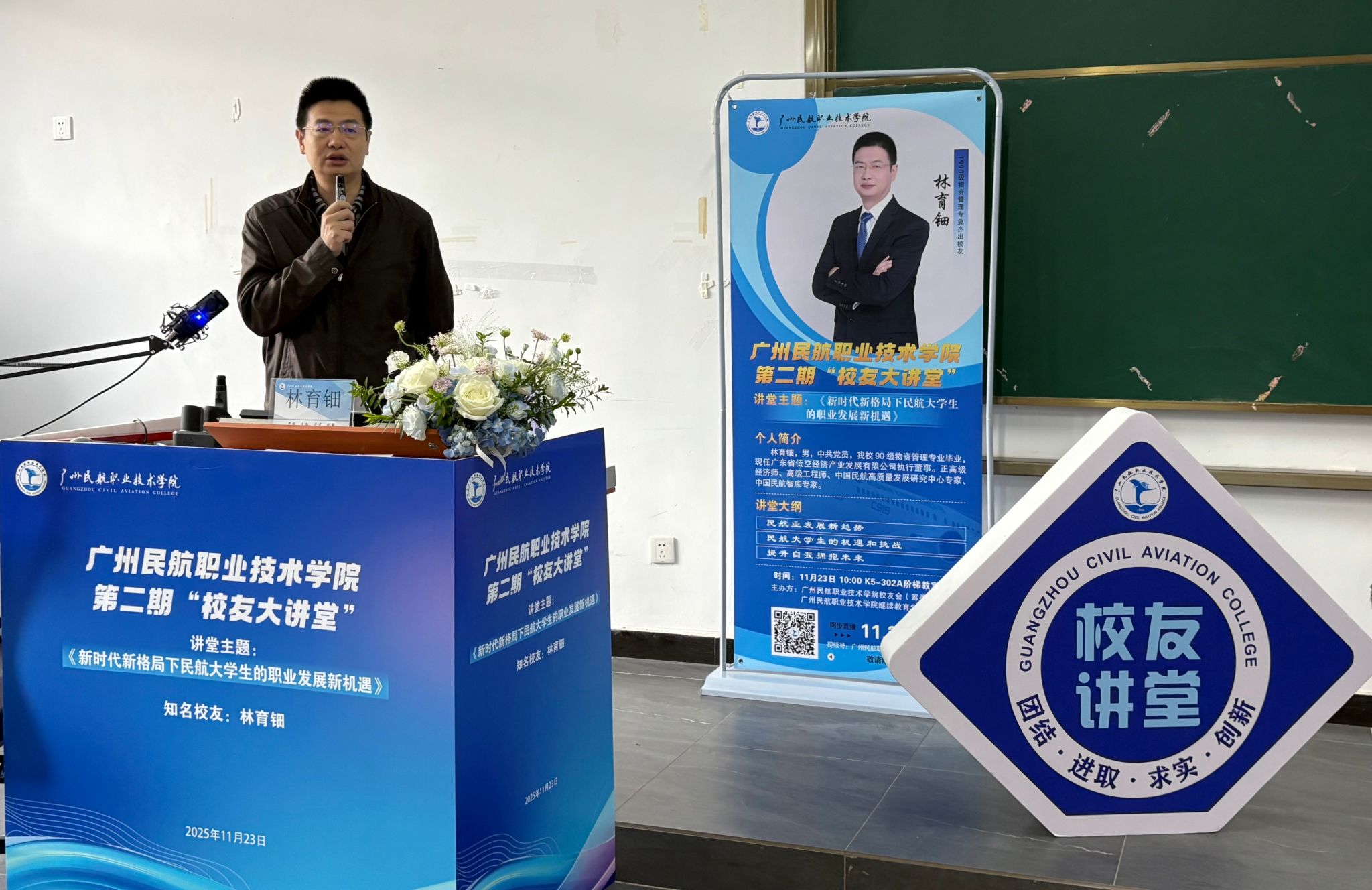讲堂伊始,邹玉明副院长对杰出校友林育钿的到来表示热烈欢迎。她简要介绍了林育钿校友的突出成绩与行业地位,作为90级物资管理专业的优秀校友,林育钿现任广东省机场集团省低空经济产业发展有限公司执行董事,正高级经济师、高级工程师,并担任中国民航高质量发展研究中心与智库专家。她强调了林育钿在民航领域的卓越成就,其职业经历和专业建树为在校学生树立了标杆,希望现场师生珍惜这次与校友面对面的学习机会,认真聆听,将所学所得所获转化为成长的指引和动力。