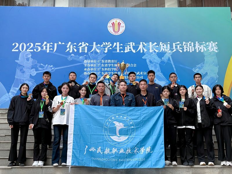 11月21日至23日,由广东省学生体育艺术联合会主办、广东科技学院承办的2025年广东省大学生武术长短兵锦标赛在东莞举行。在空中乘务学院李柏健、刘欢、陈志博老师组成的教练员队伍的带领下,我校代表队获得3金5银5铜,丙组团体第一名的好成绩。