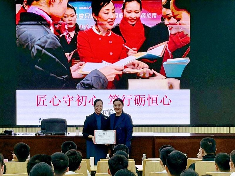 首场讲堂由空乘学院承办,党委委员余晓阳出席并为吴老师颁发客座教授聘书。空乘学院副院长肖静、刘艺涛及教师代表近200人参加。吴老师以“匠心守初心,笃行砺恒心”为主题,结合自身28年客舱服务的丰富经验,从职业信念、专业精进、规则意识、团队协作以及责任担当五个维度进行了深入浅出分享,为空乘师生指明了职业技能提升路径。