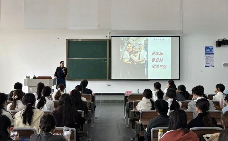 第二场讲堂由经管学院承办,院长蔡昌、副院长綦琦及师生代表近200人参加。蔡昌院长致辞时表示,民航业高质量发展离不开高素质技能人才,劳模精神正是培育职业素养的核心养分。吴尔愉老师通过高空处置突发状况、化解旅客矛盾等真实案例,引导学生坚守职业热爱,在平凡岗位中追求极致,于细微之处践行使命。她倡导以同理心构筑协作纽带,用感恩奉献传递职业温度,鼓励学生在实干中勇担责任。