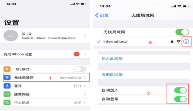 苹果手机常要把WIFI自动加入、自动登陆功能打开,否则会出现WIFI自动断开。