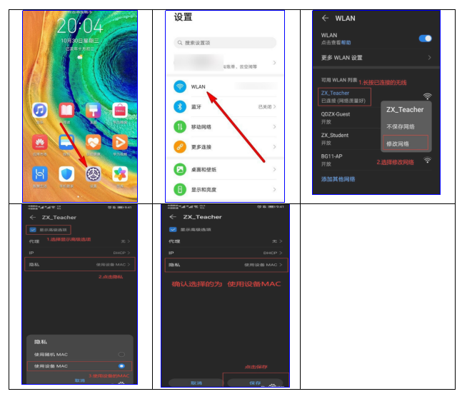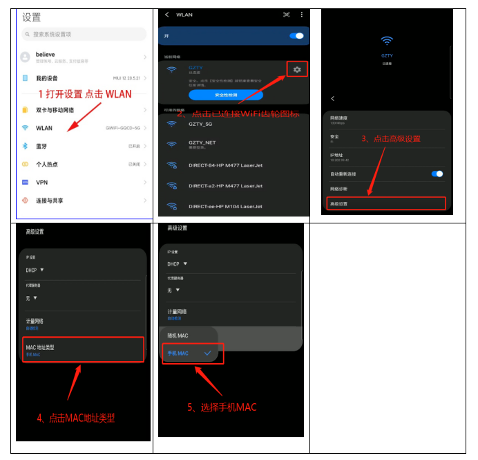 ①点击“设置”--“WLAN”-- 选择已连接的无线WLAN名称“gcac-5G”--点击右边的齿轮图标----“高级设置”--“MAC地址类型”---“选择手机MAC”---“保存”。