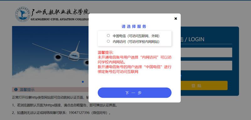 ②如需要绑定账号,请选择中国电信;如果仅需要访问校园内网(无法访问互联网),请选择内网认证。然后点击“下一步”。