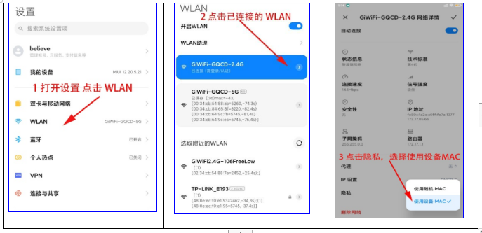 ①点击“设置”--“WLAN”-- 选择已连接的无线WLAN名称“gcac-5G”--点击“隐私”----选择“使用设备MAC”
