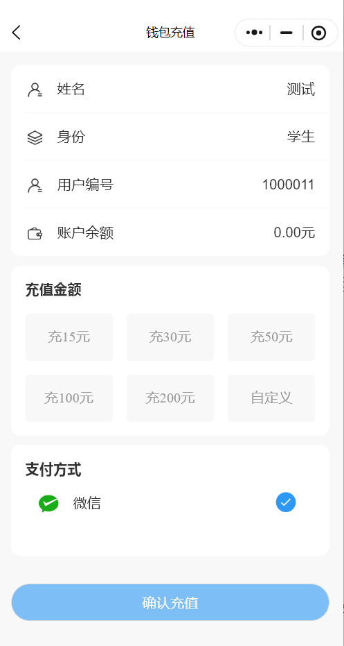 [钱包充值]::点“钱包充值”,进入如下图4充值界面,选择或输入充值金额,选择支付方式后点“确认充值”(提示:充值前请确保微信钱包有足够余额)