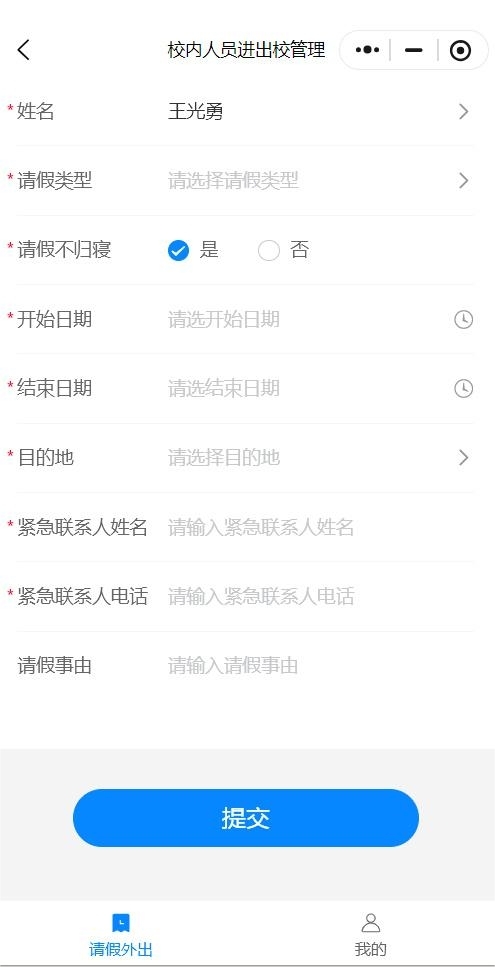 [请假]:点击“请假”进入请假模块输入对应的信息后点击提交即可进行申请请假,如下图15: