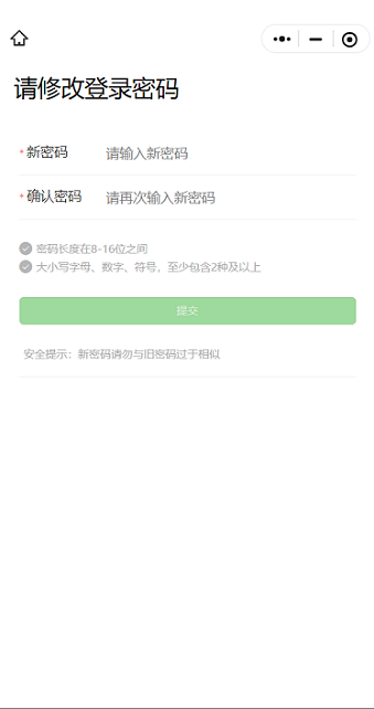 3、进入到小程序会提示修改登录密码,点击确认后进行修改密码(如下图3),修改后的密码就是以后小程序的登录密码,注意:密码需要按照符合规则进行修改