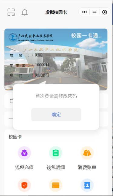 1、首次使用,请使用微信扫一扫(二维码如下图1),或搜索“广州民航职业技术学院一卡通”小程序