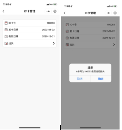 [IC卡管理]::点“IC卡管理”进入如下图8界面,在校园卡丢失后,为了防止他人使用校园卡,可在该界面对校园卡进行挂失/解挂,挂失成功后小程序校园码仍可正常使用,实体卡请前往一卡通中心或者自助补卡机上补办,