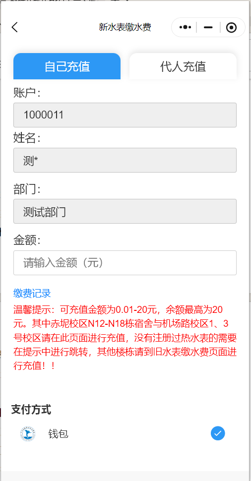 [热水充值]:入住机场路校区、实训基地校区、赤坭校区N1-N11的宿舍,从“热水充值”进入充值界面(如下图12),录入金额,选择支付方式,输入支付密码即可缴费。