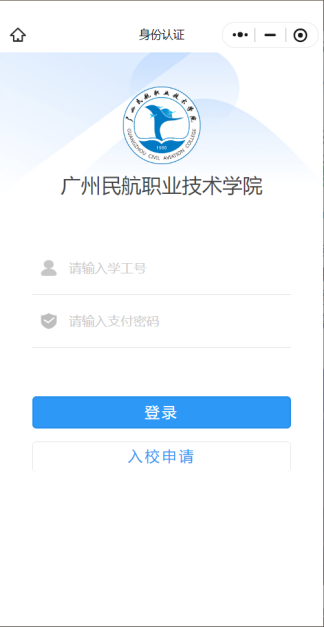 2、在身份认证界面(如下图2)输入学生ID号或者教工号、密码进入“广州民航职业技术学院一卡通”小程序,所有人密码默认为身份证后六位(最后一位为X的,则密码往前推一位),若使用以上密码登录均提示错误,请携带身份证前往学校一卡通中心进行重置密码,校外持临时卡人员需携带身份证及临时卡往一卡通中心获取账号密码。