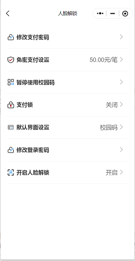 [钱包安全]:点“钱包安全”进入如下图8界面,可修改支付密码、登录密码(初始密码为身份证后六位(最后一位为X的,则密码往前推一位)),登录小程序后请及时修改密码,忘记密码的请到学校一卡通中心重置密码),如下图7。