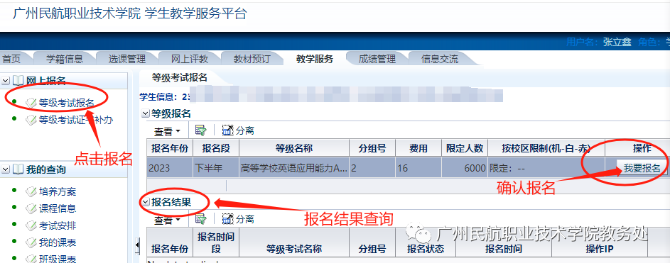 1.点击学生教学服务平台链接,输入个人用户11位ID号和密码登录,登录后通过学生教学服务平台进行报名。
