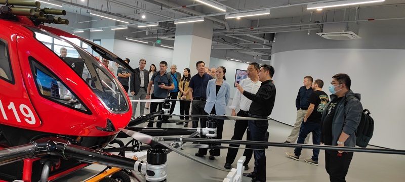 在亿航智能宽阔的展厅里,陈列着锁定全球第一张无人驾驶航空器适航证的EH216-S型载人无人机、不同用途的多旋翼无人机、载人复合翼无人机及各类飞行器部件产品。亿航公司蒋瑜涛副总裁亲自介绍了EH216-S型载人无人机的发展历程,详细介绍了亿航智能的企业文化、各个版块的业务发展取得的成果、公司发展趋势与定位及未来发展愿景。