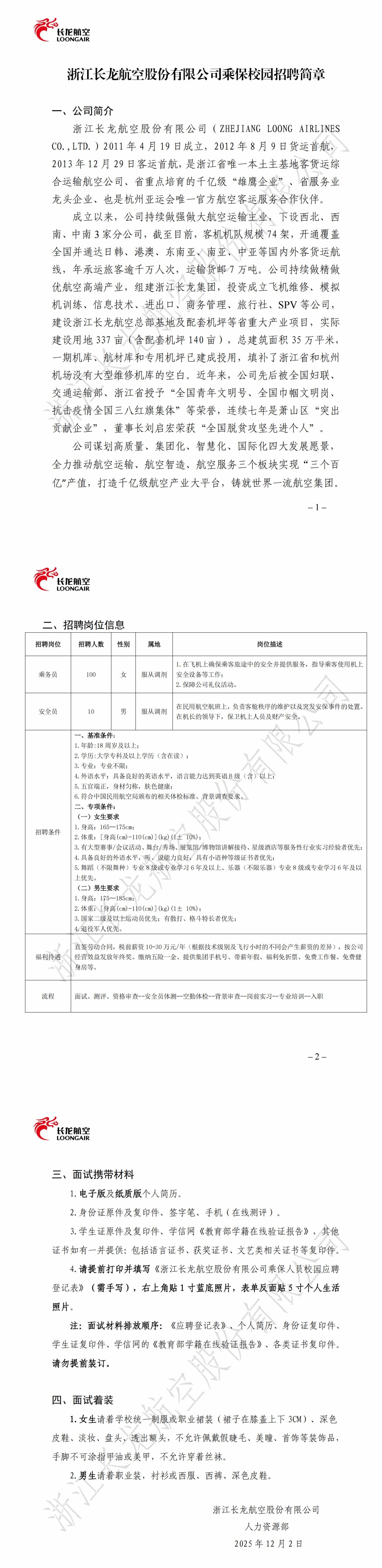 浙江长龙航空股份有限公司乘保校园招聘简章