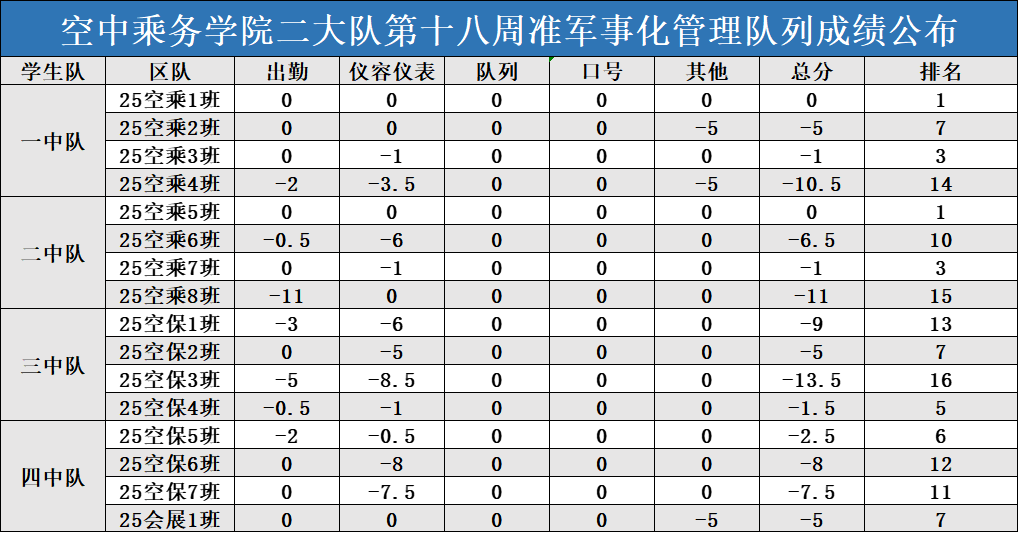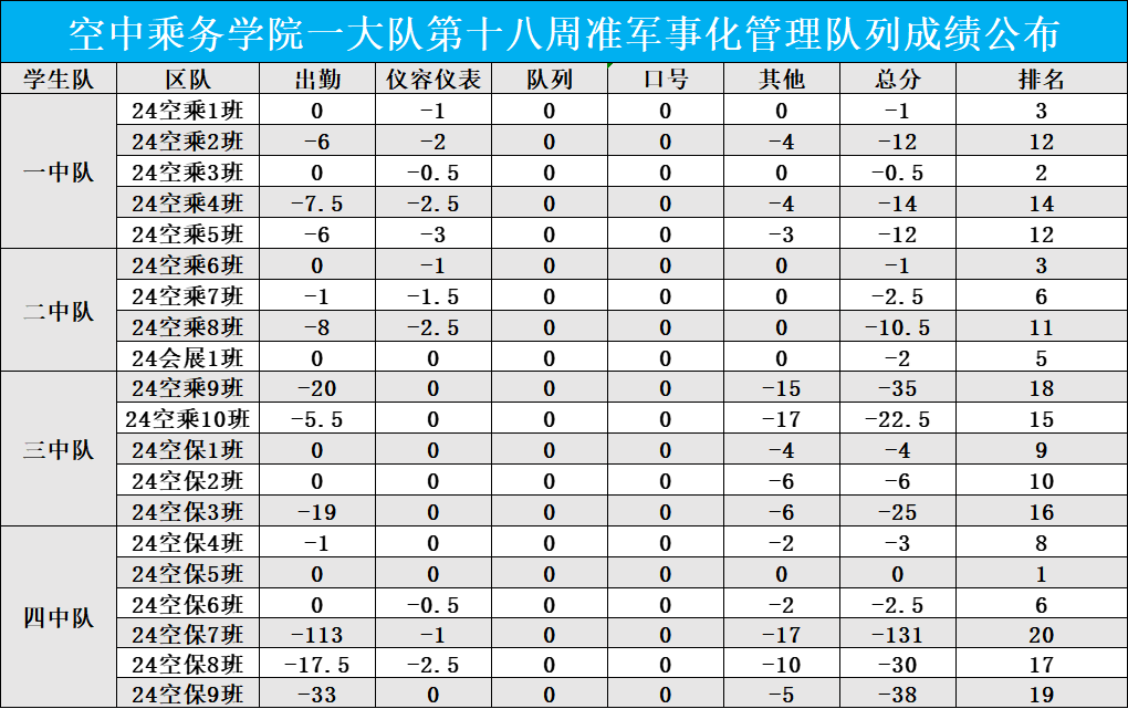 空中乘务学院准军事化管理队列成绩公布栏(第十八周)