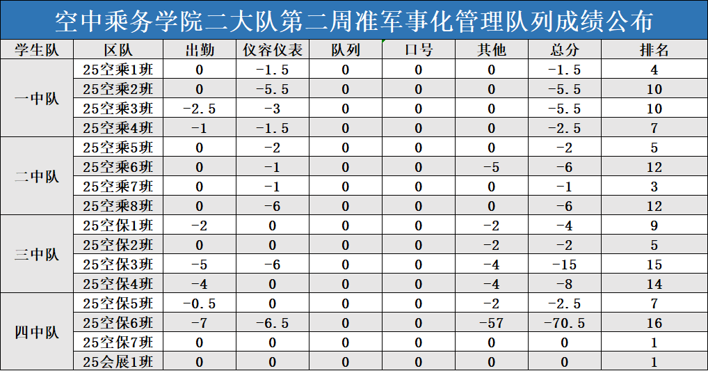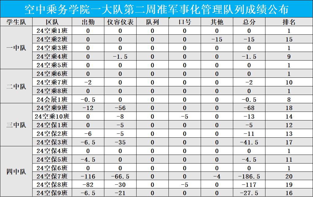 空中乘务学院准军事化管理队列成绩公布栏(第二周)