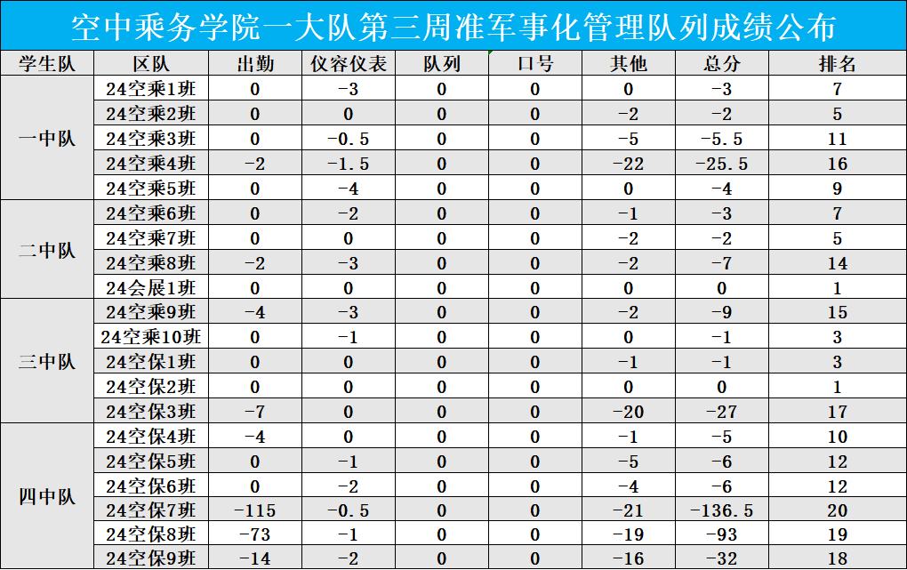 空中乘务学院准军事化管理队列成绩公布栏(第三周)