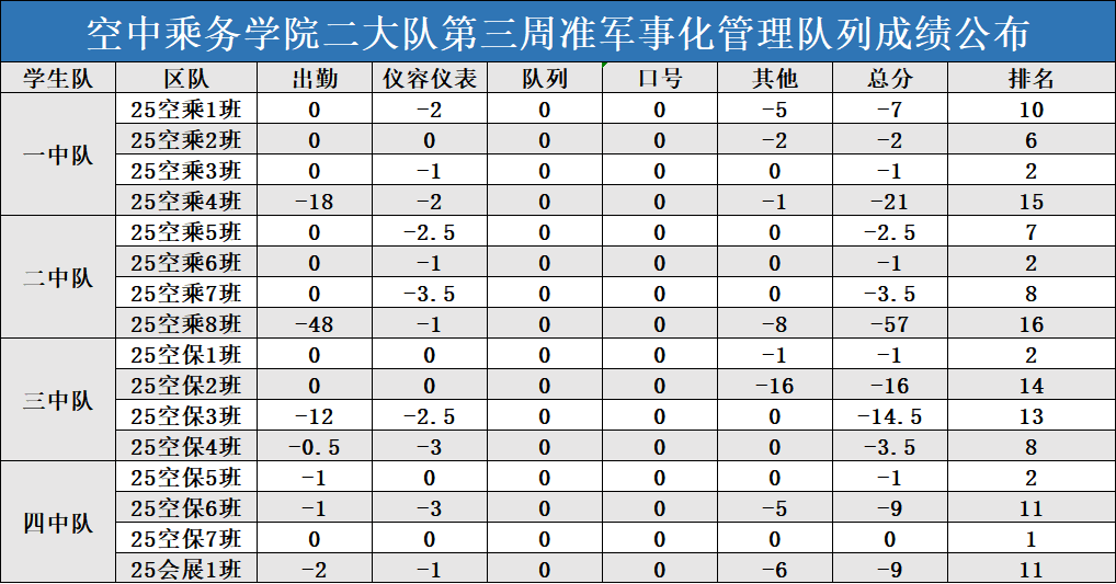 空中乘务学院准军事化管理队列成绩公布栏(第四周)