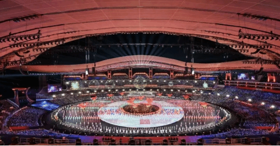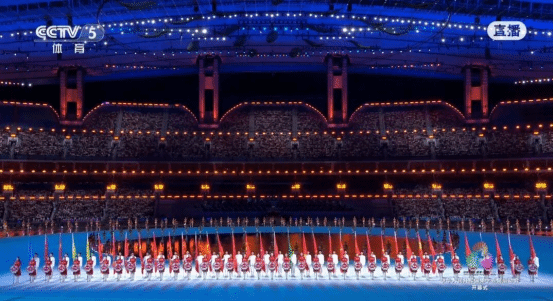 开幕式分体育仪式和文艺展演两个环节。其中,在体育仪式环节,共有38个代表团的裁判员、运动员入场;文艺展演则以“圆梦未来”为主题,分为“同根同源”“同心同缘”“同梦同圆”三大篇章。聚光灯下,开幕式体育仪式的华彩乐章中,有一道格外醒目而庄严的风景线——那便是由我院40名旗帜标兵和24名引导员组成的演职人员队伍。