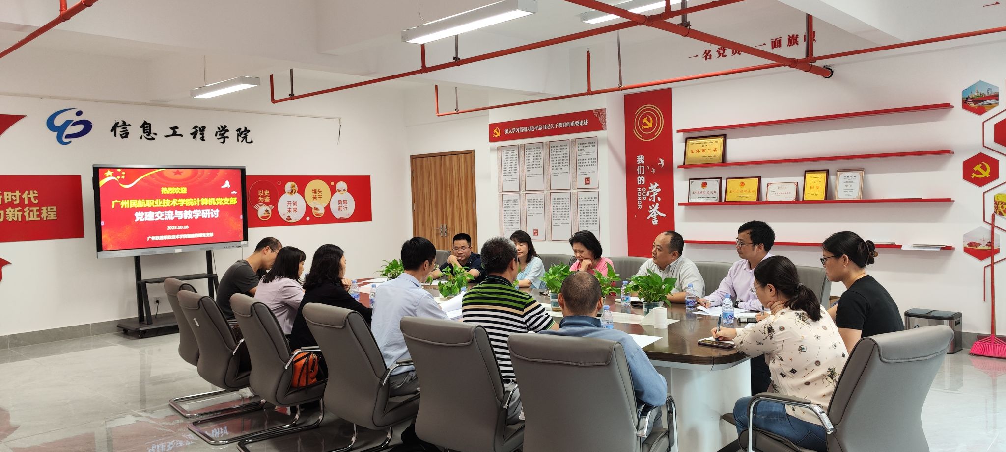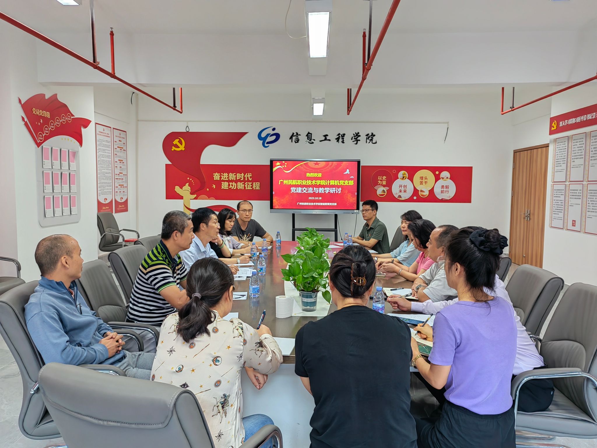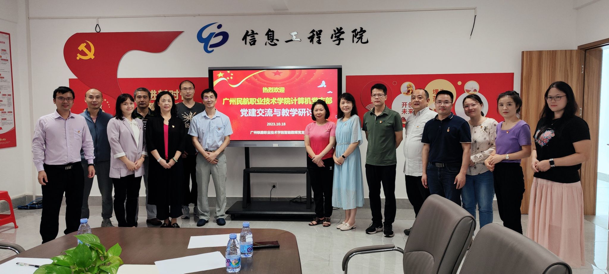 为更好地促进党建与业务的深度融合,加强与兄弟院校的交流与学习,10月18日,民航电子信息工程学院计算机党支部全体党员和骨干教师到广州铁路职业技术学院智能数媒党支部开展党建交流与教学研讨。广州铁路职业技术学院信息工程学院孟思明院长、智能数媒党支部书记陈超老师以及支部党员、骨干教师出席了交流会。