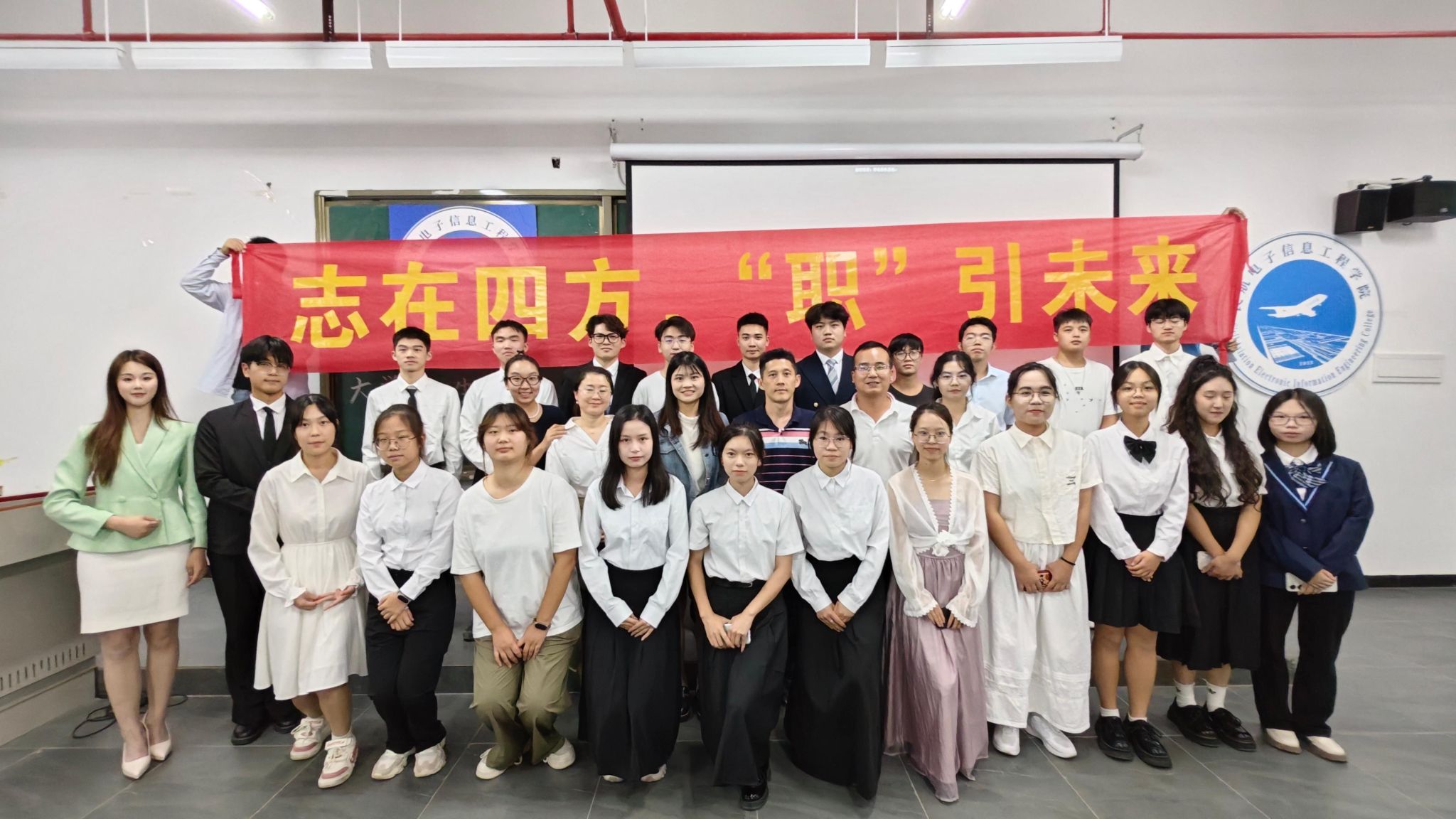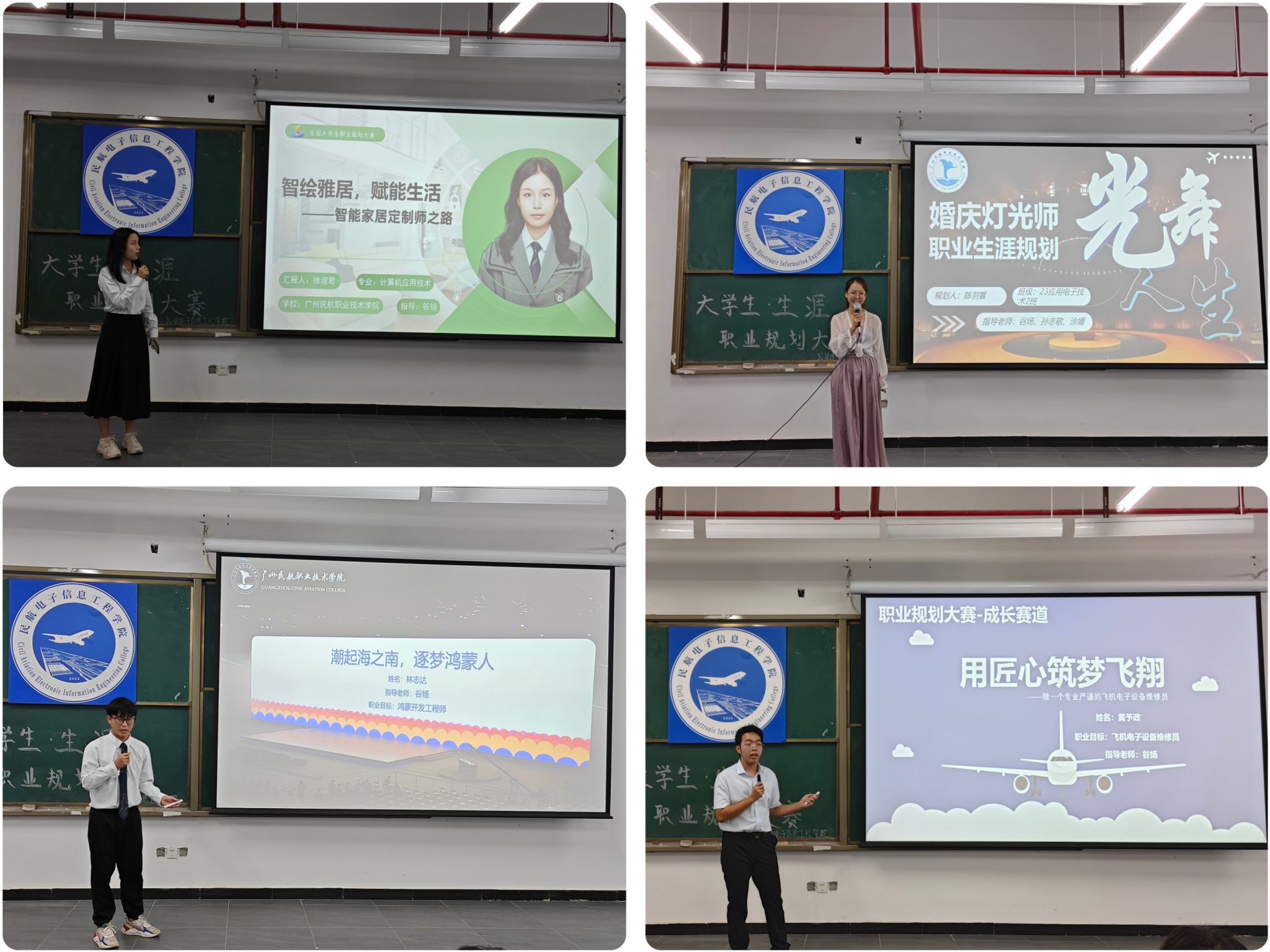 为贯彻落实党中央、国务院关于高校毕业生就业工作的决策部署,激发学生职业生涯规划意识,帮助学生树立正确的就业观,促进高质量充分就业,民航电子信息工程学院于11月11日晚在赤坭校区举办了第二届大学生职业规划大赛院赛决赛。特邀民航电子信息工程学院副院长周裕昊、学工办主任卢海标、副主任陈兵兵,民航经营管理学院团总支书记杨帆,飞机维修工程学院周倩雯老师、郑宇辰老师担任评委