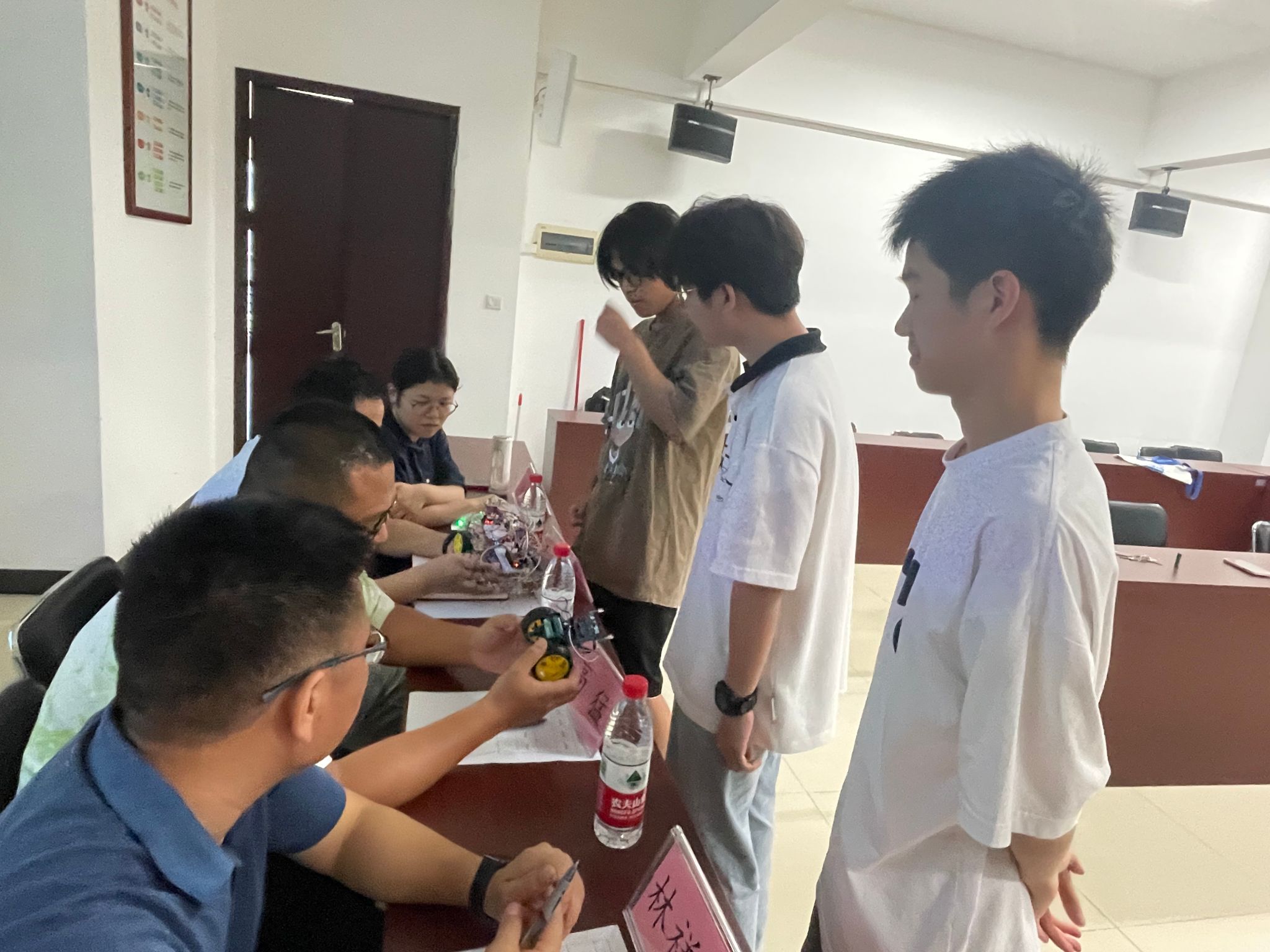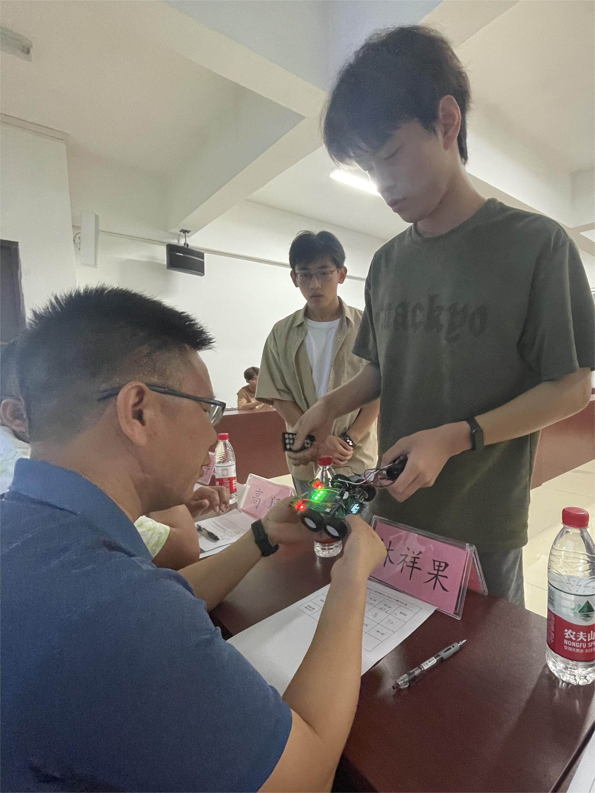 同学们紧密协作,充分发挥团队的力量,将自己的奇思妙想转为实际作品,经过选拔,共有10支队伍进入决赛。6月13日组织现场答辩,邀请7位老师作为现场评委。答辩会上,各参赛队伍神采飞扬、充满自信地展示作品的功能、性能、创新点等,现场氛围热烈。评委们根据学生作品完成度,创新性及知识理解程度等进行多维评价打分,评选出7个优秀作品并颁奖鼓励。