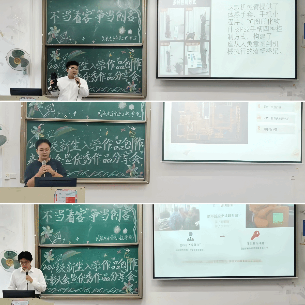 11 月 5 日,民航电子信息工程学院在赤坭校区 K3-209 召开 2024 级新生入学作品创作表彰大会暨优秀作品分享会。集中展示了“红领创客——学生优秀作品创作工程”的丰硕育人成果,为电信学子们的创新实践之旅开启生动开篇。