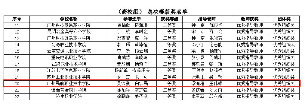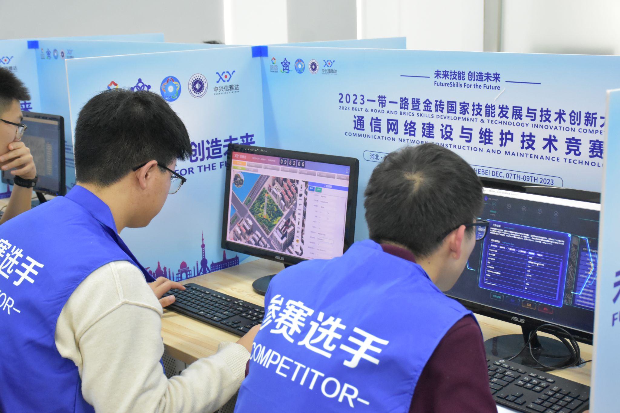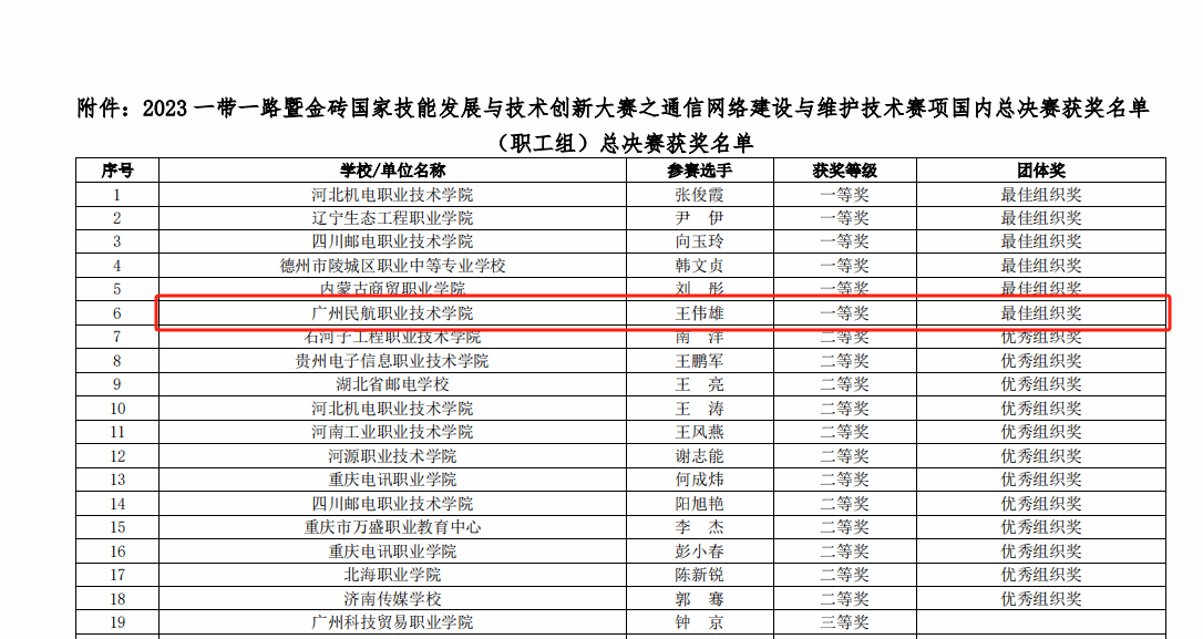 12月8日,2023一带一路暨金砖国家技能发展与技术创新大赛“通信网络建设与维护技术”赛项全国总决赛在河北机电职业技术学院举行。经过激烈比拼,我校民航电子信息工程学院王伟雄老师获得职工组一等奖;由王伟雄、梁有程老师指导的吴钦豪、白宗民组成的学生参赛队获得二等奖。