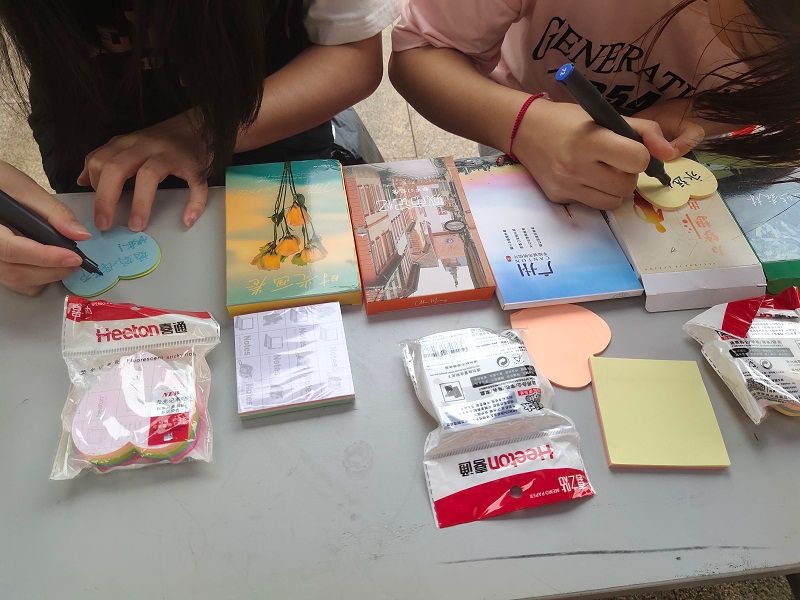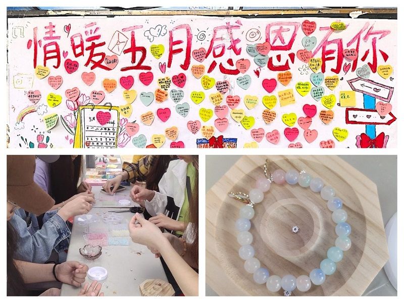 活动伊始,筑梦服务队工作人员认真宣讲活动规则,并鼓励学生们通过实际行动表达对母亲的感激。随后,同学们纷纷拿起彩色的便利贴,真挚地写下对母亲的想说的话语并贴在心愿墙上。此外,还有一个特别的惊喜环节——只要写下祝福,同学们就可以获得一次DIY手链的机会或领取一张精美明信片。他们根据自己的喜好选择珠子、线绳等材料,神情专注,沉浸其中,一边制作、一边想象着母亲收到这份礼物时的喜悦和感动。