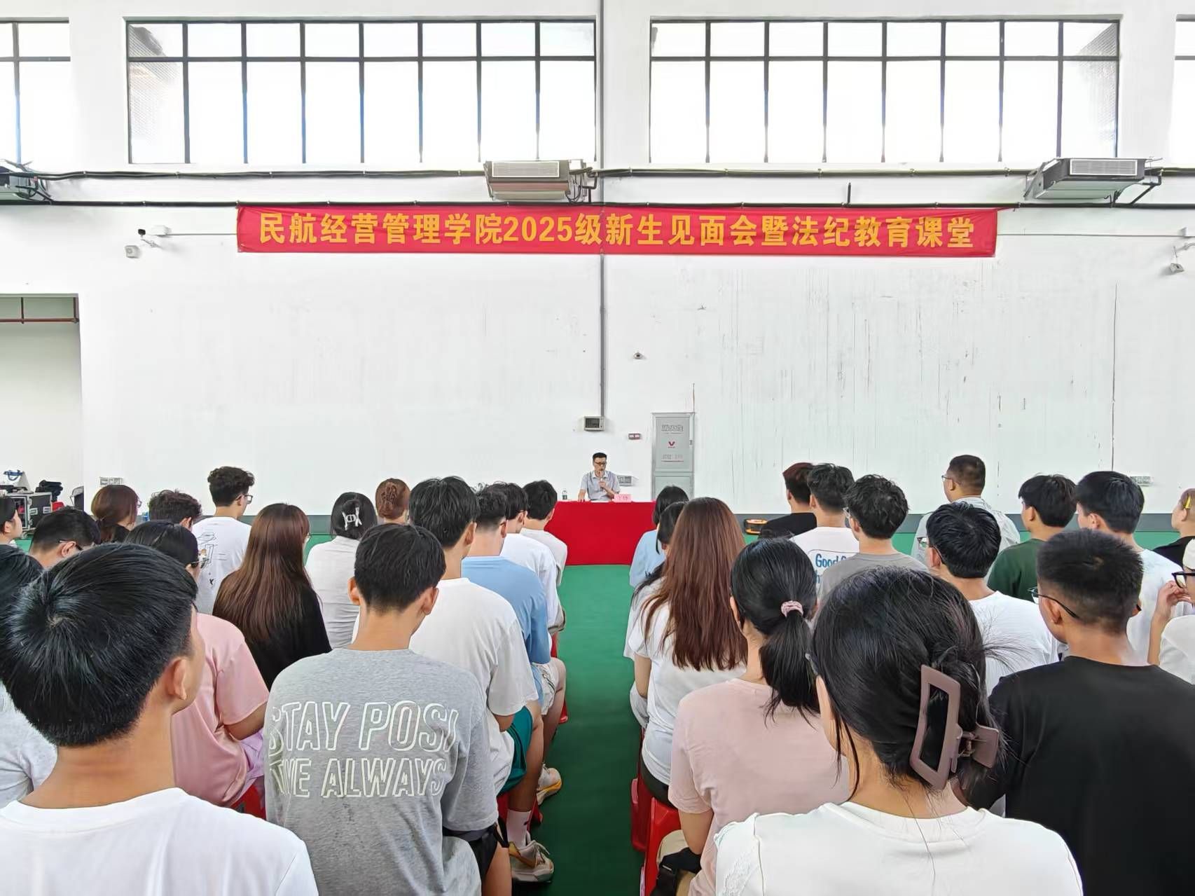 9月19日上午,民航经营管理学院2025级新生见面会暨法纪教育课堂在赤坭校区体育馆举行,学院领导班子、各教研室主任、三办一中心人员、新生辅导员和全体2025级新生参加了本次活动。会议由学工办主任林巧珠主持。