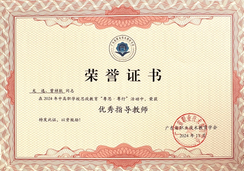 为统筹推进“大思政课”建设,聚焦立德树人根本任务,广东省职业技术教育学会思政工作委员会于今年10月开展2024年中高职学校思政教育“粤学·粤思·粤行”活动。此次“粤学”活动一等奖 5 名,二等奖 6 名,三等奖 7 名;“粤思”活动一等奖 6 名,二等奖 7 名,三等奖 9 名;“粤行”活动一等奖6 名,二等奖 6 名,三等奖 6 名;“粤思•粤行”活动优秀指导教师 12 组。