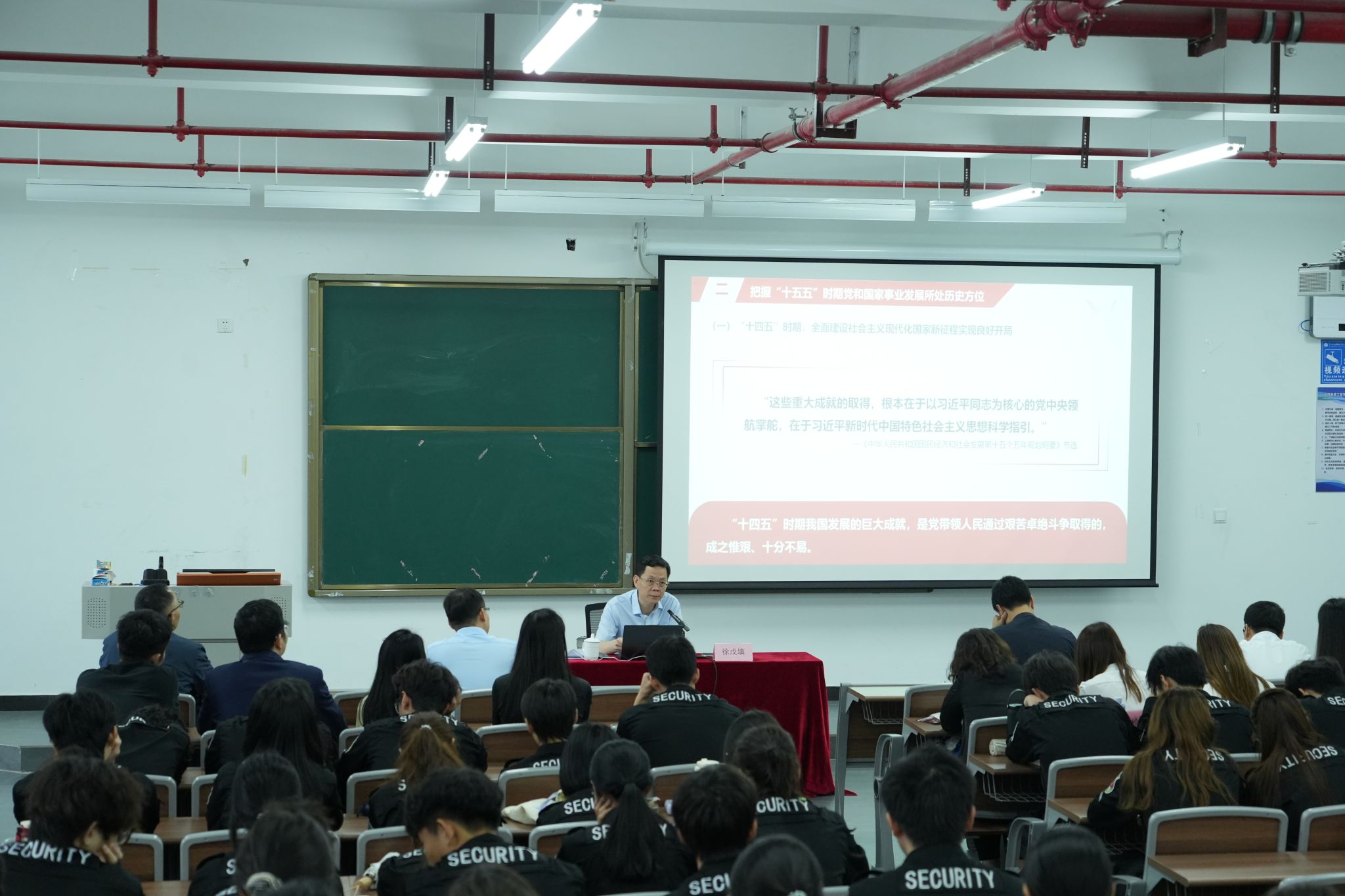 徐戊填书记紧扣2026年全国两会精神与“十五五”规划纲要,系统回顾我国五年规划实施历程与“十四五”时期取得的辉煌成就,深入阐释“十五五”时期在全面建设社会主义现代化国家进程中的关键方位、历史机遇与挑战。他围绕“十五五”时期经济社会发展的指导思想、重要原则、主要目标与战略部署进行系统解读,帮助师生准确把握国家发展蓝图。
