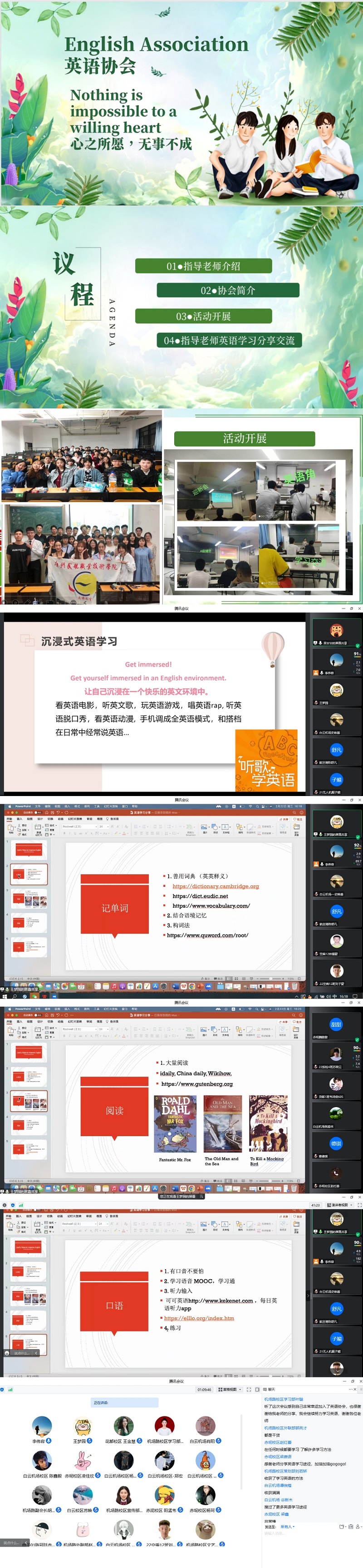 2月22日下午,学校英语协会在腾讯会议召开三个校区的社团培训指导会。会议由学校英语协会负责人兼白云机场校区英语协会指导老师李伟容副教授、赤坭校区英语协会指导老师王梦园老师以及机场路校区英语协会指导老师吴甘甘老师主持召开,全校英语协会共计94名同学参加了会议。